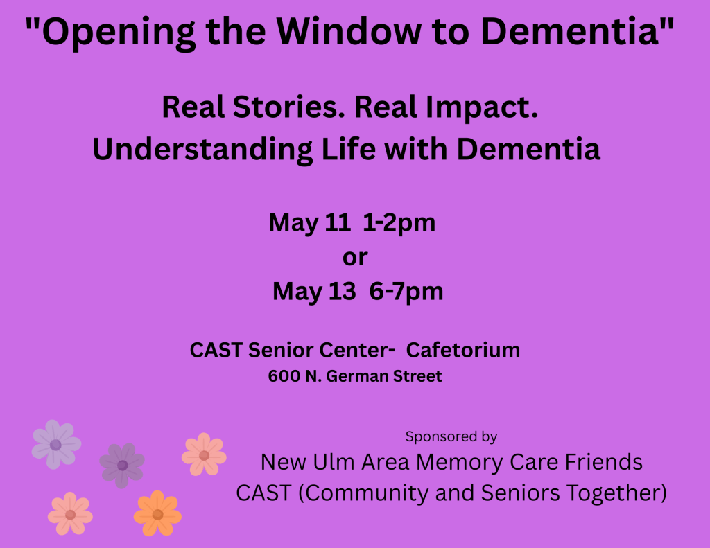 Provided by the CAST Senior Center, presented by the Alzheimer’s Caregiver Support Group, and hosted by Karla Hansel and Geri Groebner. For more information, call Karla at 507-354-3187.