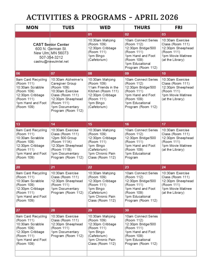 The CAST Senior Center is open 8am-4pm Monday – Friday, year-round. The Senior Center is closed in observance of holidays on New Year’s Day, Martin Luther King, Jr. Day, Good Friday, Memorial Day, Junteenth, Independence Day, Labor Day, Thanksgiving, the day after Thanksgiving, Christmas Eve day and Christmas Day.