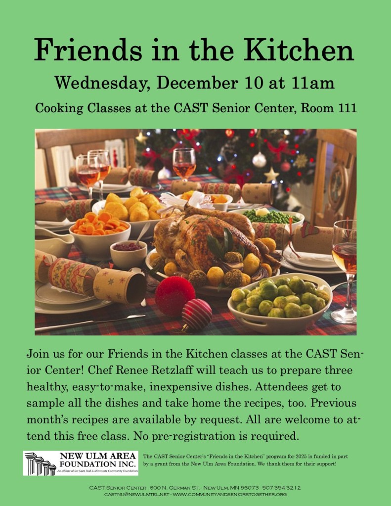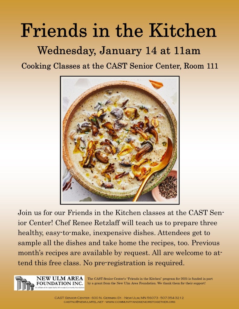 The CAST Senior Center’s “Friends in the Kitchen” program for 2025 is funded in part by a grant from the New Ulm Area Foundation. We thank them for their support!