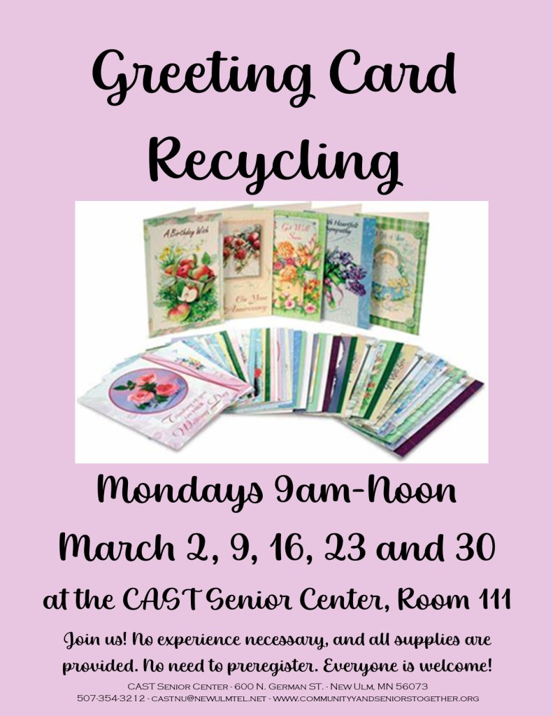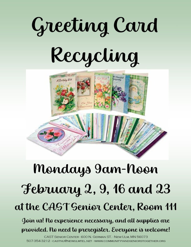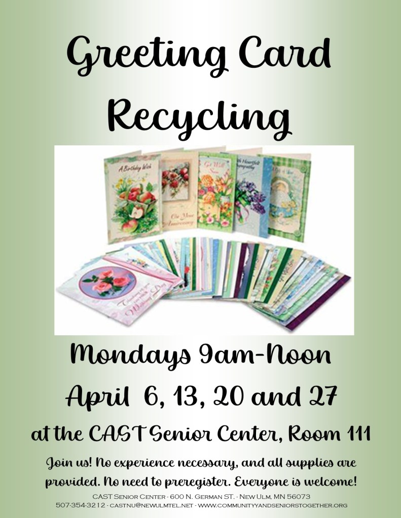 The CAST Senior Center has an enthusiastic group that creates our beautiful greeting cards from previously used cards. They meet every Monday morning from 9am-12pm. Newcomers are always welcome to join! No experience necessary. For more information, call the CAST office at 507-354-3212.