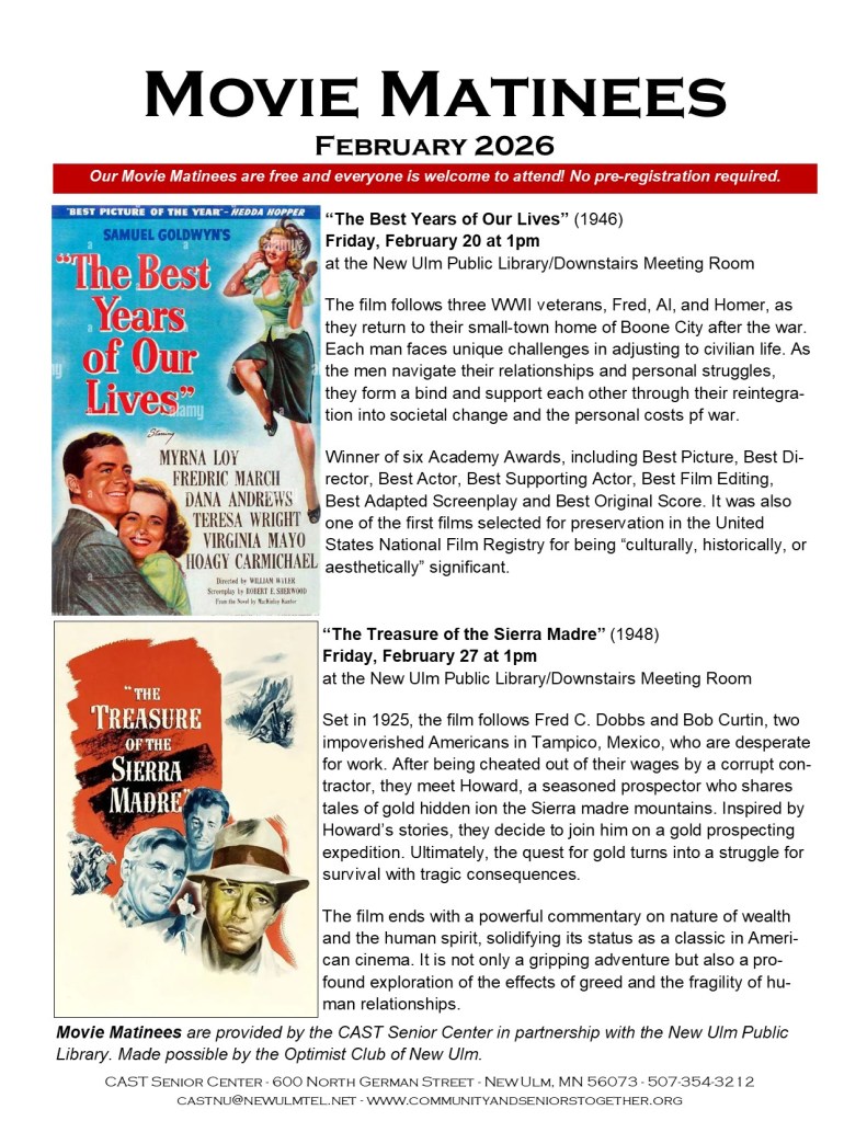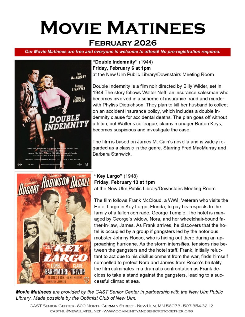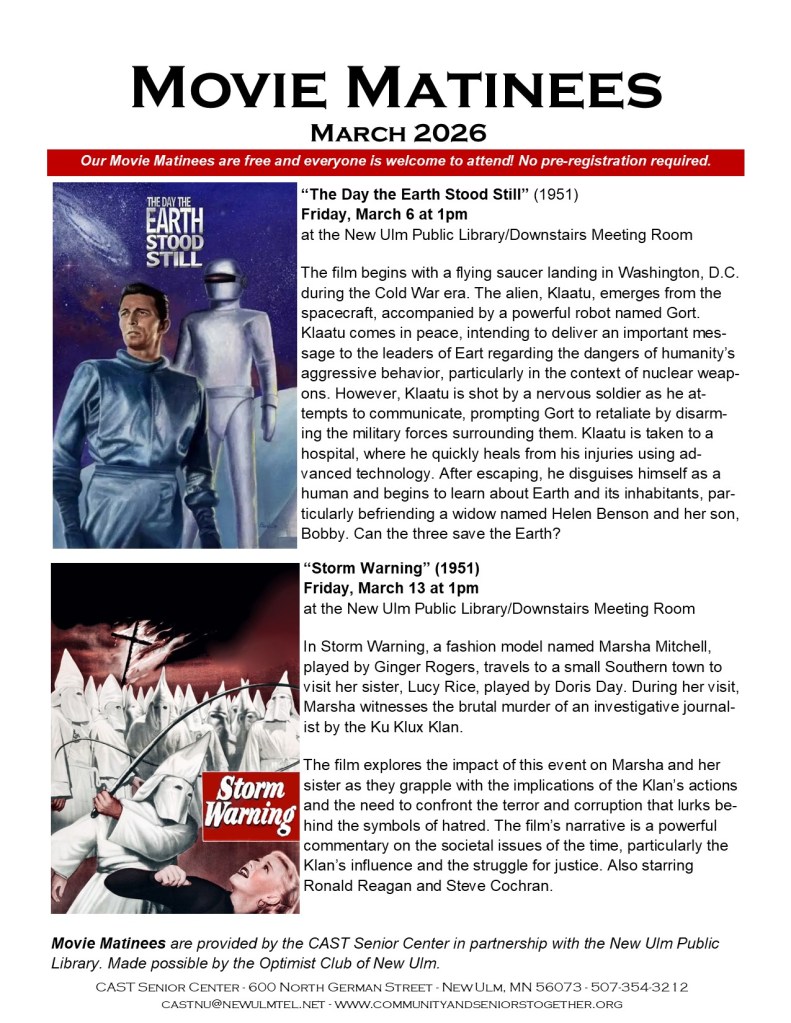 The CAST Senior Center is partnering with the New Ulm Public Library to bring you Movie Matinees. Made possible by the Optimist Club of New Ulm.Held in the Meeting Room in the lower level of the New Ulm Public Library, we present movies on Friday afternoons at 1pm. Our movies are free, and everyone is welcome to attend. No preregistration needed.