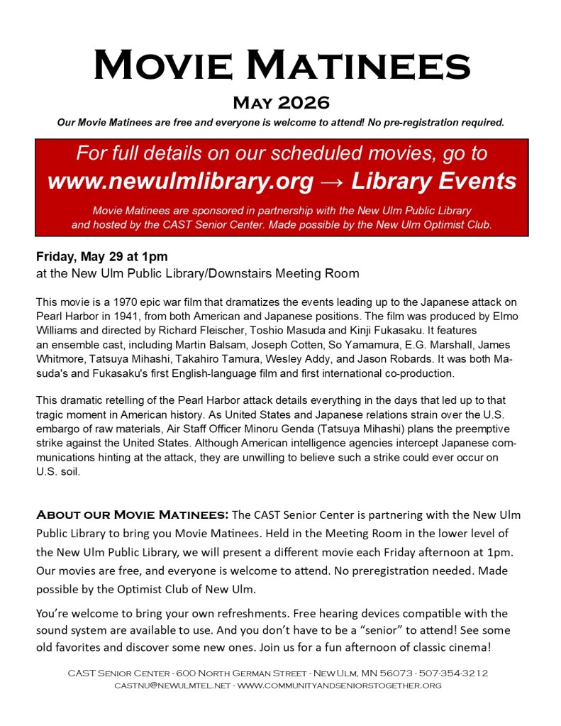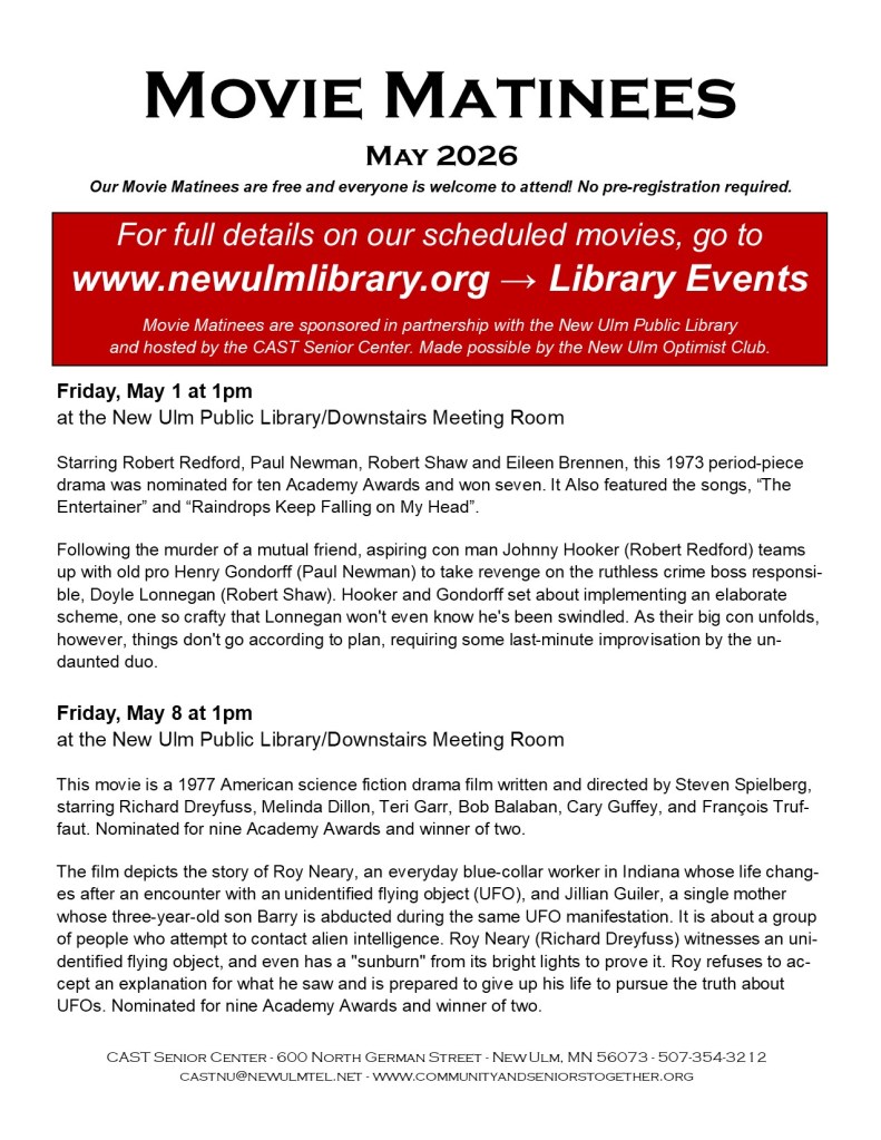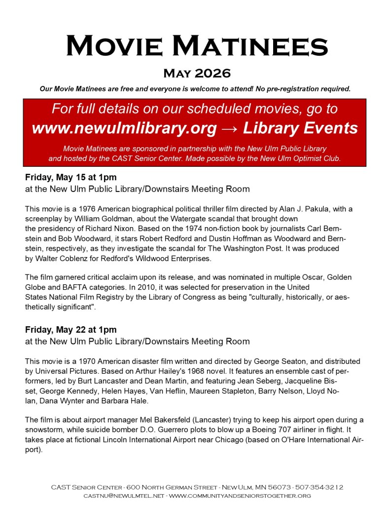 The CAST Senior Center is partnering with the New Ulm Public Library to bring you Movie Matinees. Made possible by the Optimist Club of New Ulm.