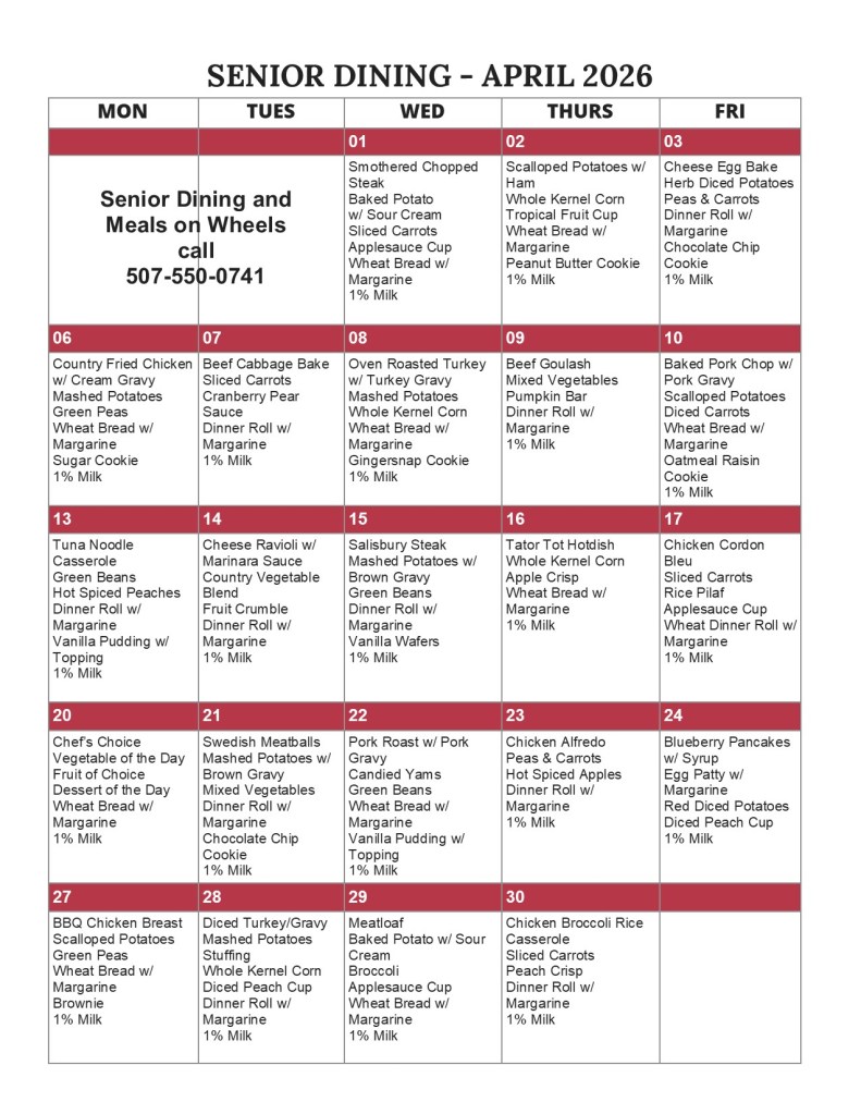 Join us every weekday for In-Person Senior Dining in the Cafetorium at the New Ulm Community Center/CAST Senior Center. Lunch is served at 11am. Call 507-550-0741 by 1pm the day prior (Friday for Monday) to reserve your meal.