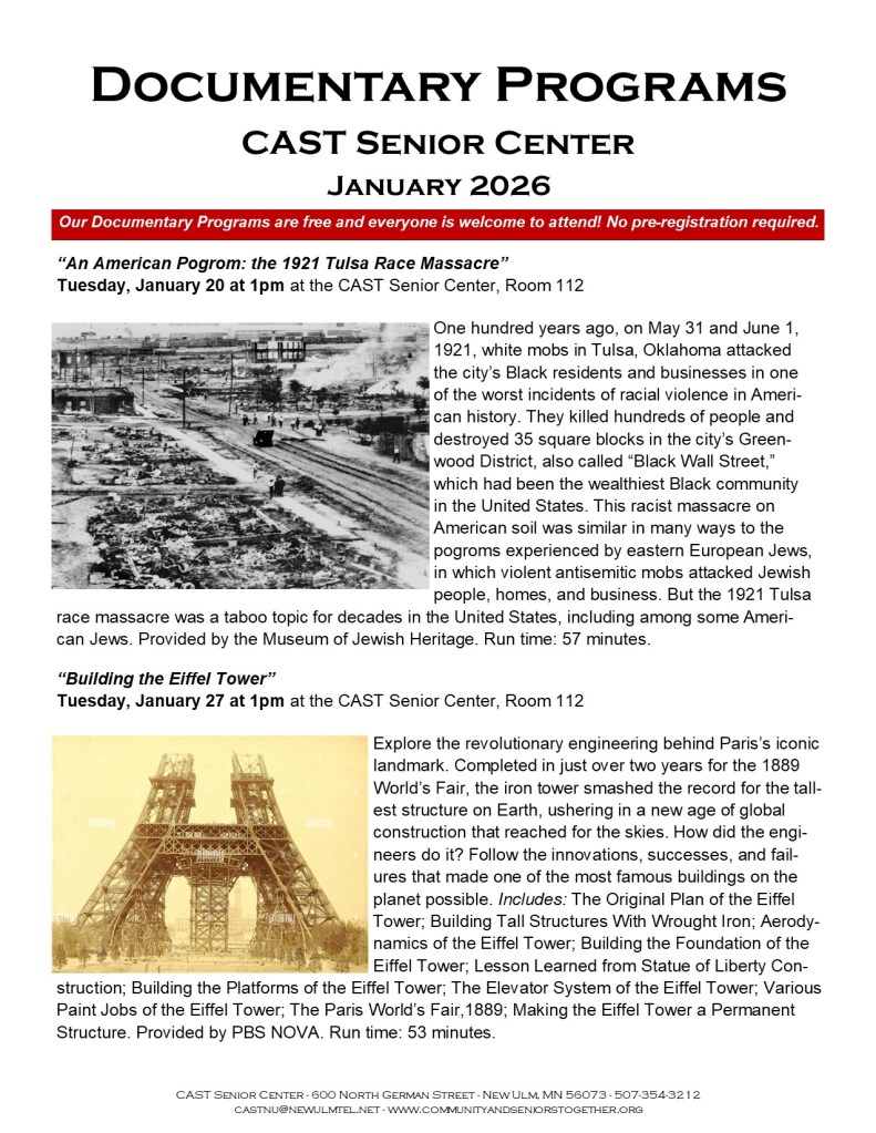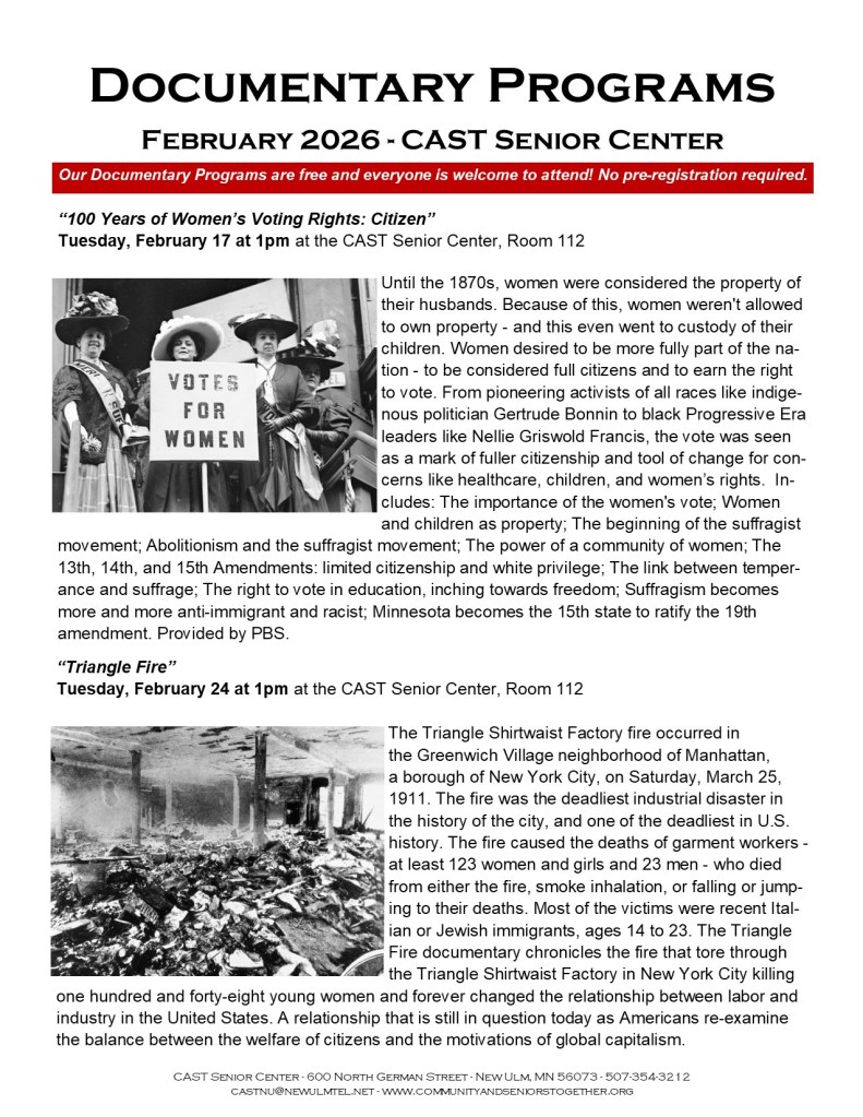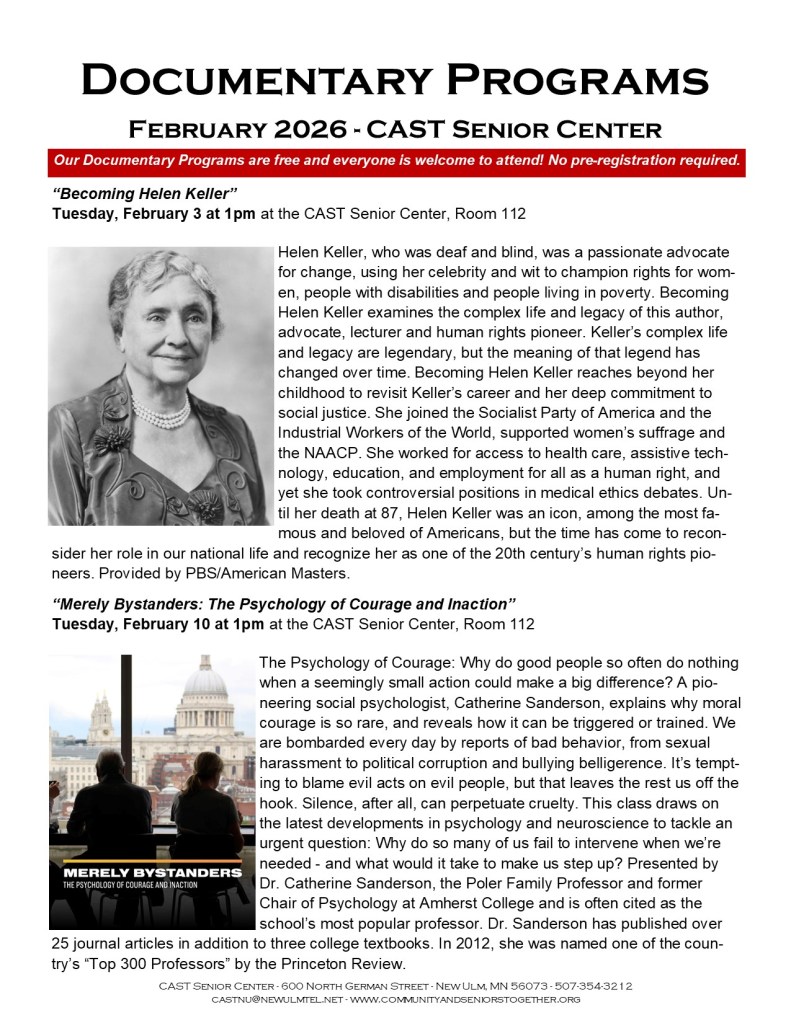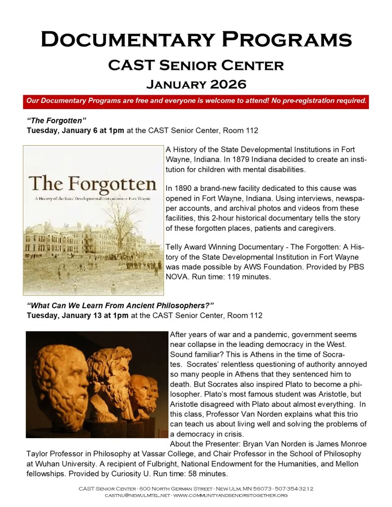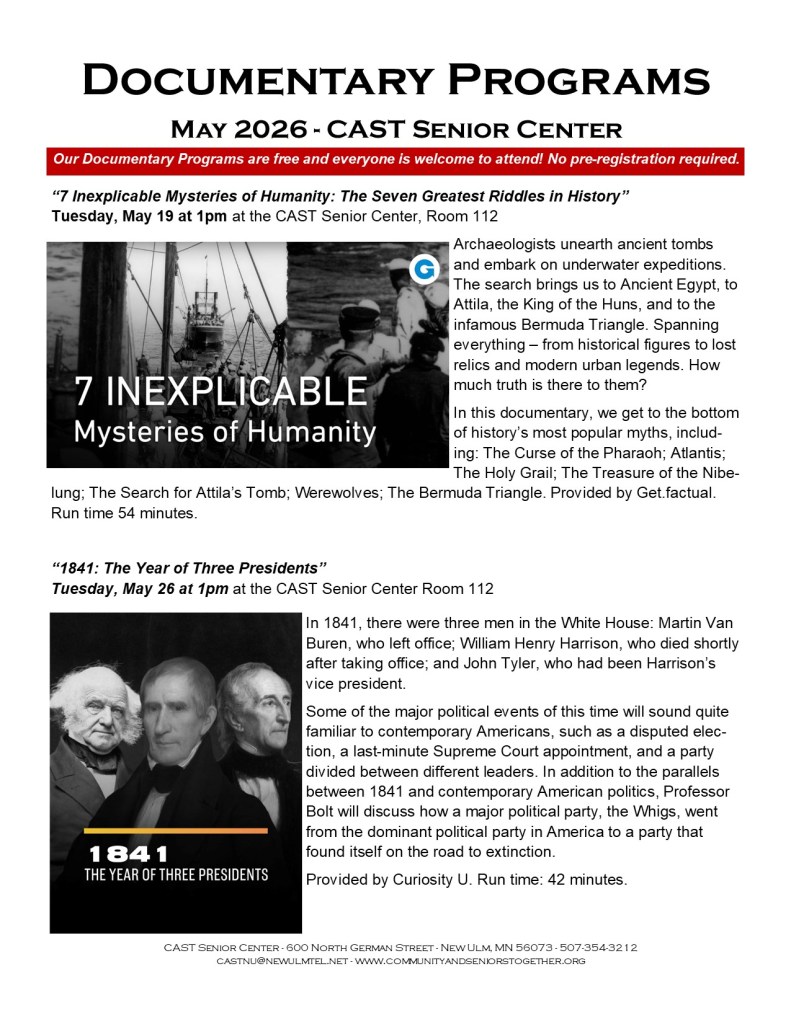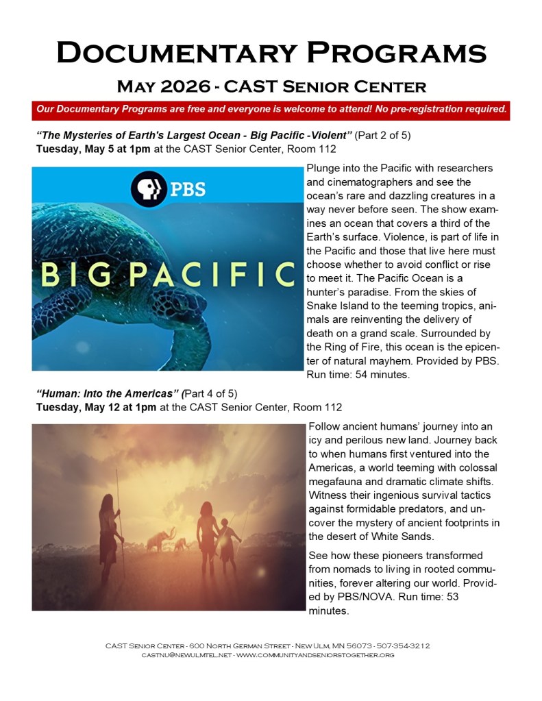 Welcome to CAST Documentary Programs! Provided by the CAST Senior Center, our Documentary Programs provide an endless variety of interesting subjects in a prerecorded, professional film format. They take us across the country and around the world, experiencing and learning about places and people which we wouldn’t otherwise have the opportunity to experience. Our documentaries are entertaining, informative, and inspiring. They offer a unique and powerful form of storytelling that captures your attention and provoke thought and discussion. Scheduled every Tuesday afternoon, unless noted, at 1pm at the CAST Senior Center, our Documentary Programs are free and open to the public. There are no membership dues, and everyone is welcome to attend. Programming is provided by Curiosity U and other online providers. Check out our documentary program schedule every month and join us. We look forward to seeing you!